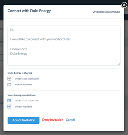 If you connect with other organizations and give permission to see your vendors, they will only see the rating data you provide for a vendor. They will not see details such as vendor contract terms or vendor contacts.
