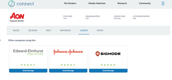 Access the Research tab and type in the vendor’s name. Select the vendor’s logo to access their Profile. The Clients section will show you if any of your connections are working with that vendor.