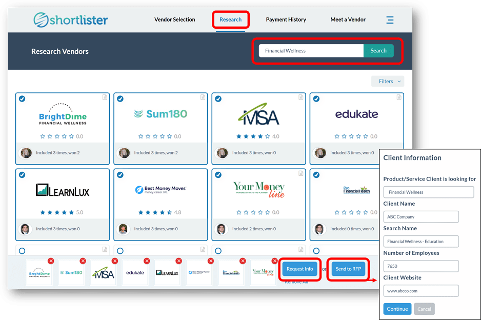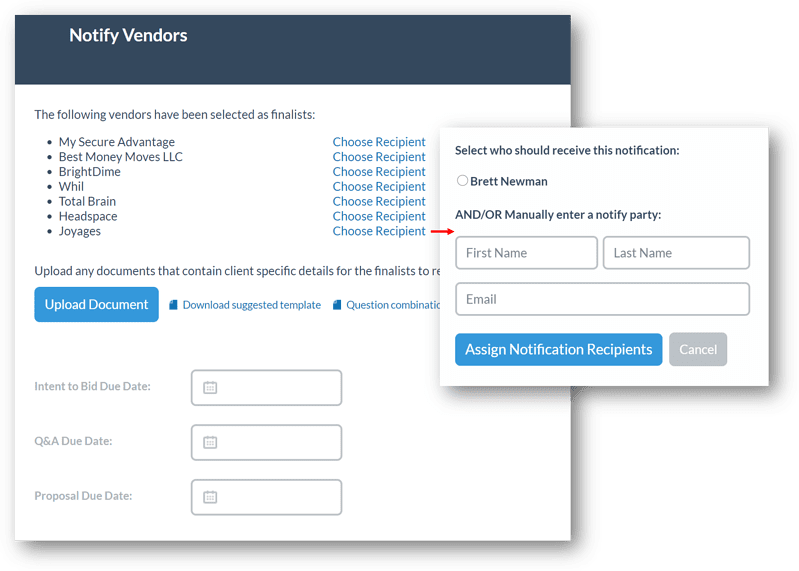 We know relationships matter to you and ensuring your main vendor contact handles your client’s program is often important. Identify your personal vendor contacts, when desired, to be sure they see the RFP request from Shortlister.