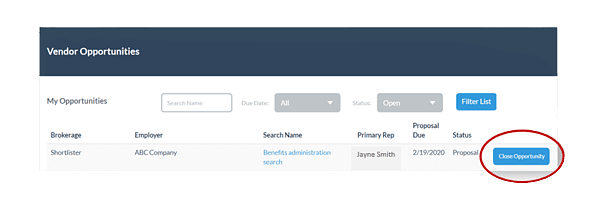 If an RFP has remained open for a long period of time and you know that you didn’t win the business or the RFP has concluded, please use the Close Opportunity button to indicate if you won the business or were eliminated. A message will be sent to the subscriber who issued the RFP to prompt them to confirm and close out the project. Once the closing details are complete on their end, the Status will be updated accordingly.