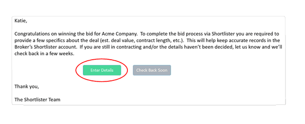 Shortlister will send an email confirming you are the winning vendor and ask you to Enter Details* about the contract: