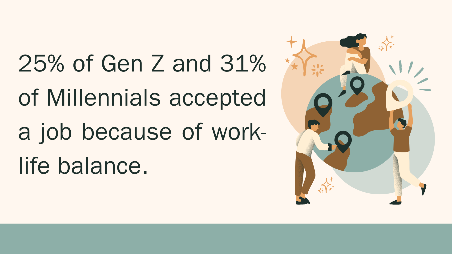 Findings from a Deloitte survey show that Gen Z and Millennials seek new levels of work-life balance. In fact, it was the leading reason why they chose an employer, with 25% of Gen Z and 31% of Millennials citing it.
