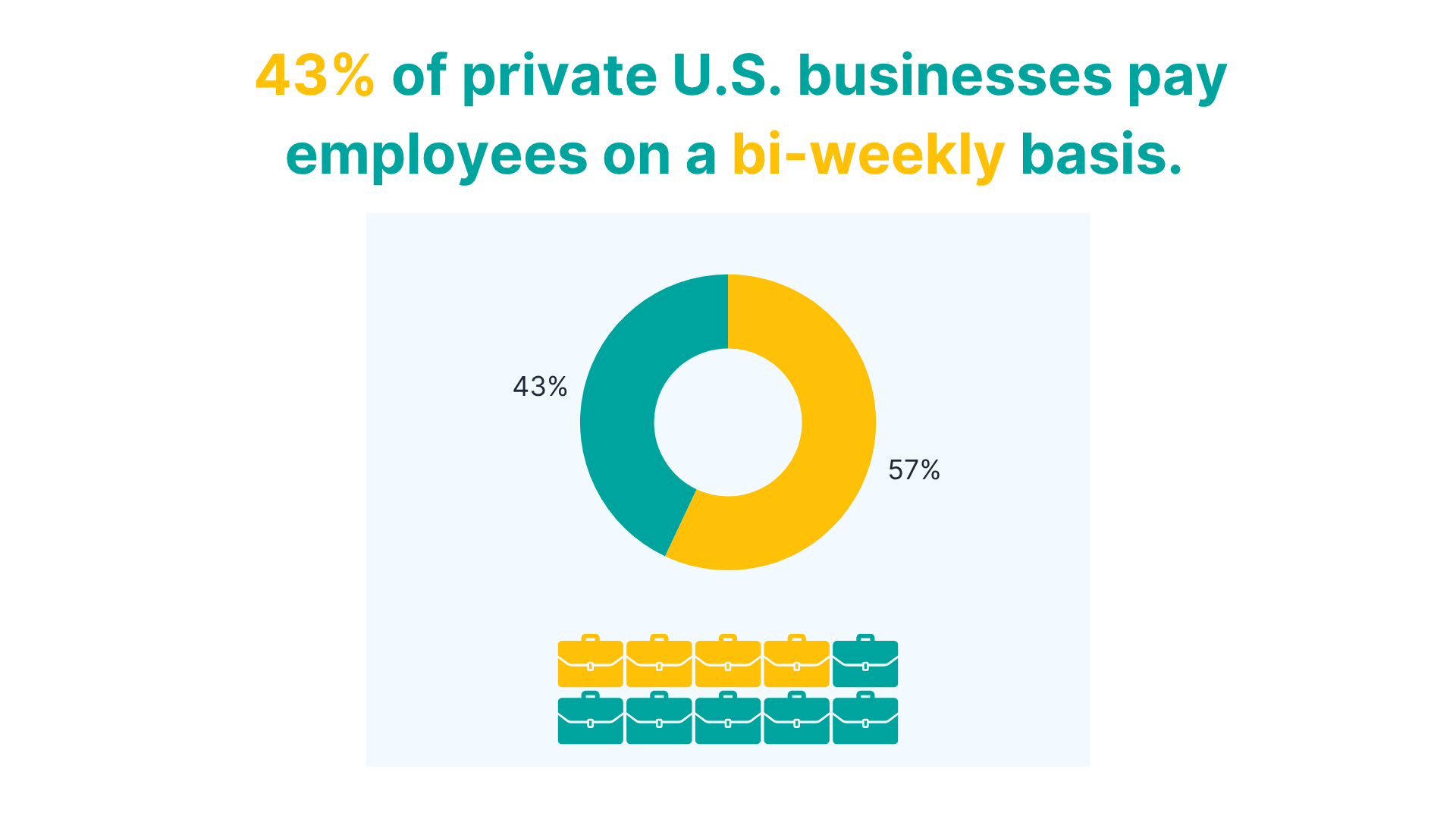 According to government data, bi-weekly payroll is the most popular pay frequency among U.S. employers. In fact, 43% of private U.S. businesses pay employees on a bi-weekly basis.