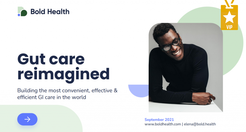 Bold Health is reimagining how GI conditions are treated by putting patients at the center of care with convenient, effective and efficient care pathways. We are the first and only company to provide members with access to a virtual multidisciplinary care team (of a GI doctor and nurse, dietician, GI psychologist and a health coach), as well as to evidence-based digital therapeutic programs for self-management.