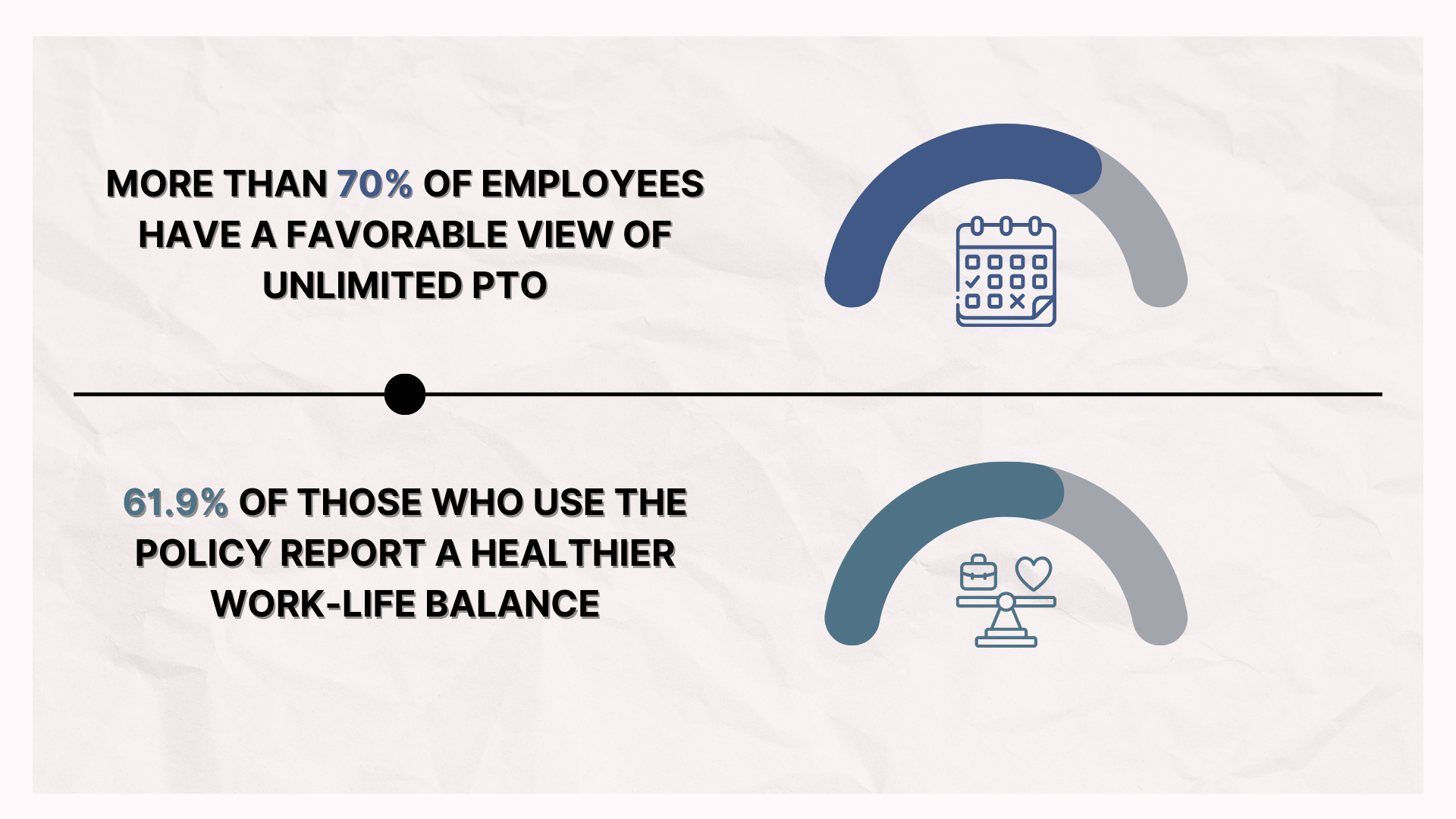 Research supports this, as a Joblist study found that nearly three out of four employees have a favorable view of an unlimited PTO policy, and another 61.9% report a healthy work-life balance.