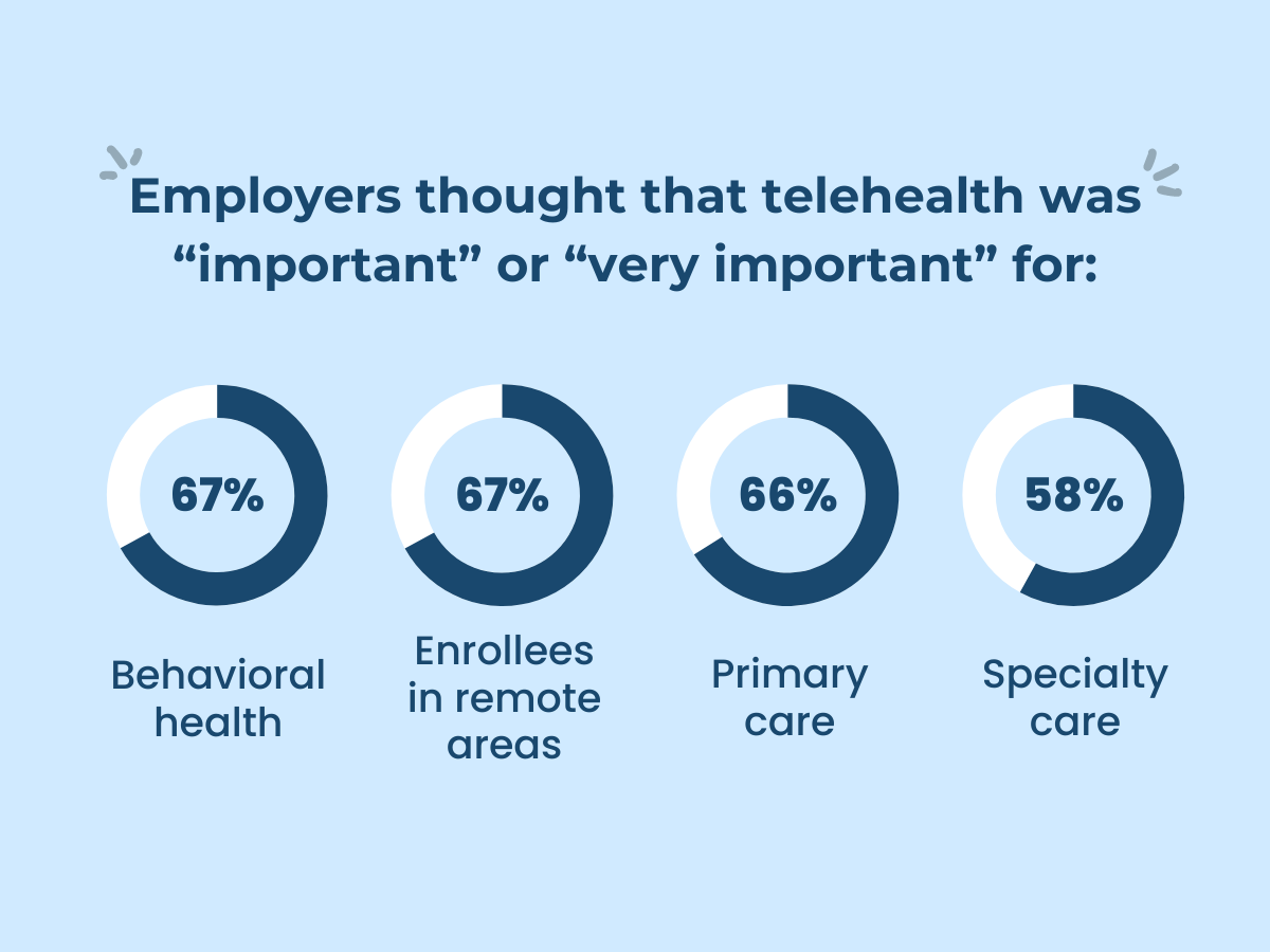 Moreover, when asked about its future importance, employers thought that telehealth was “important” or “very important” for: