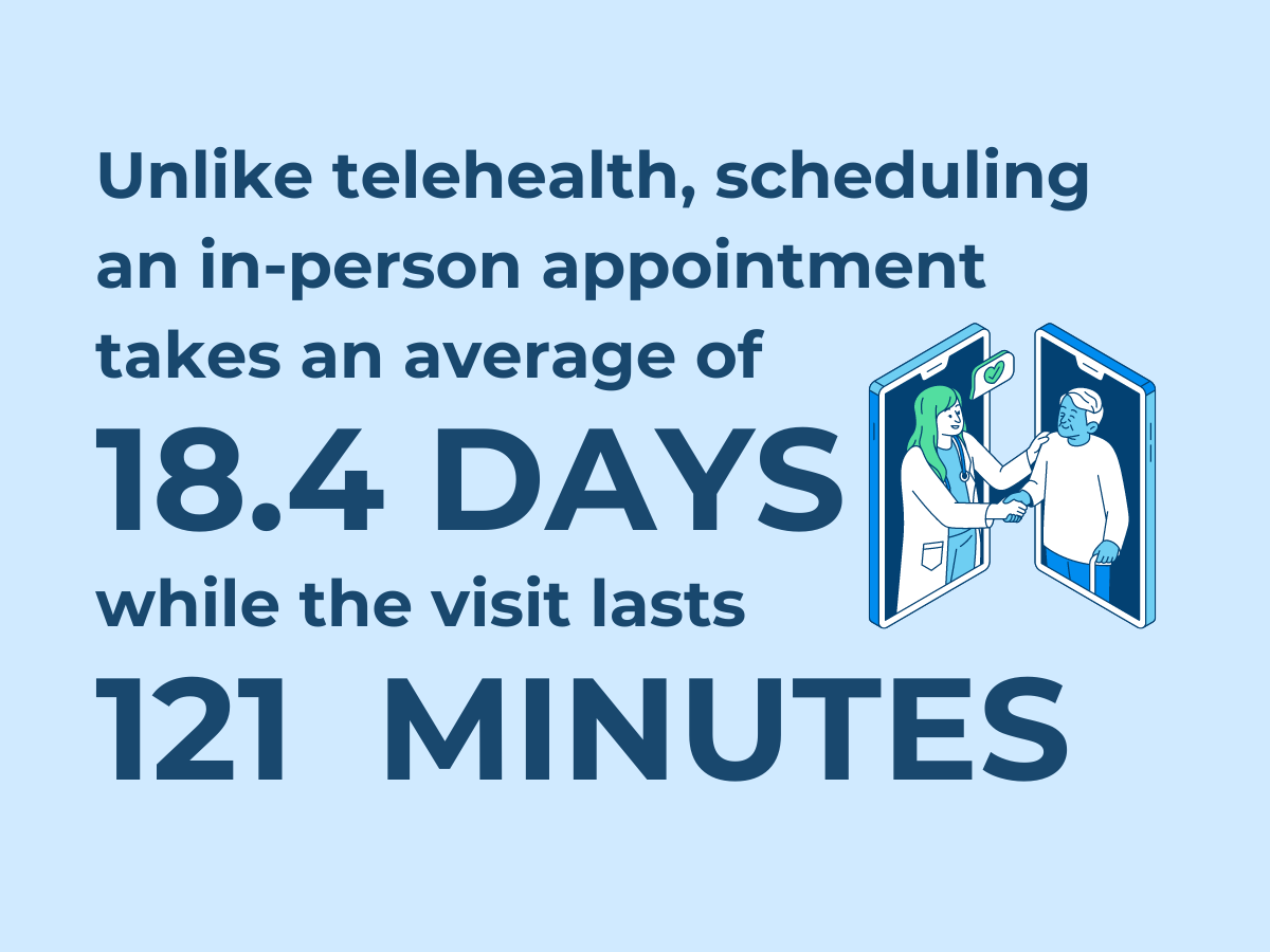 In-Person Care: Unlike telehealth, scheduling an in-person appointment takes an average of 18.4 days, while the visit lasts 121 minutes.