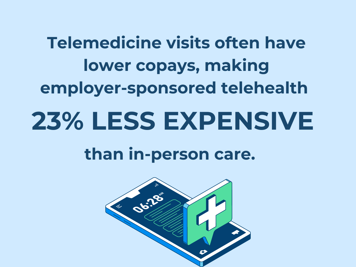 Moreover, studies show telemedicine visits often have lower copays, making employer-sponsored telehealth 23% less expensive than in-person care.