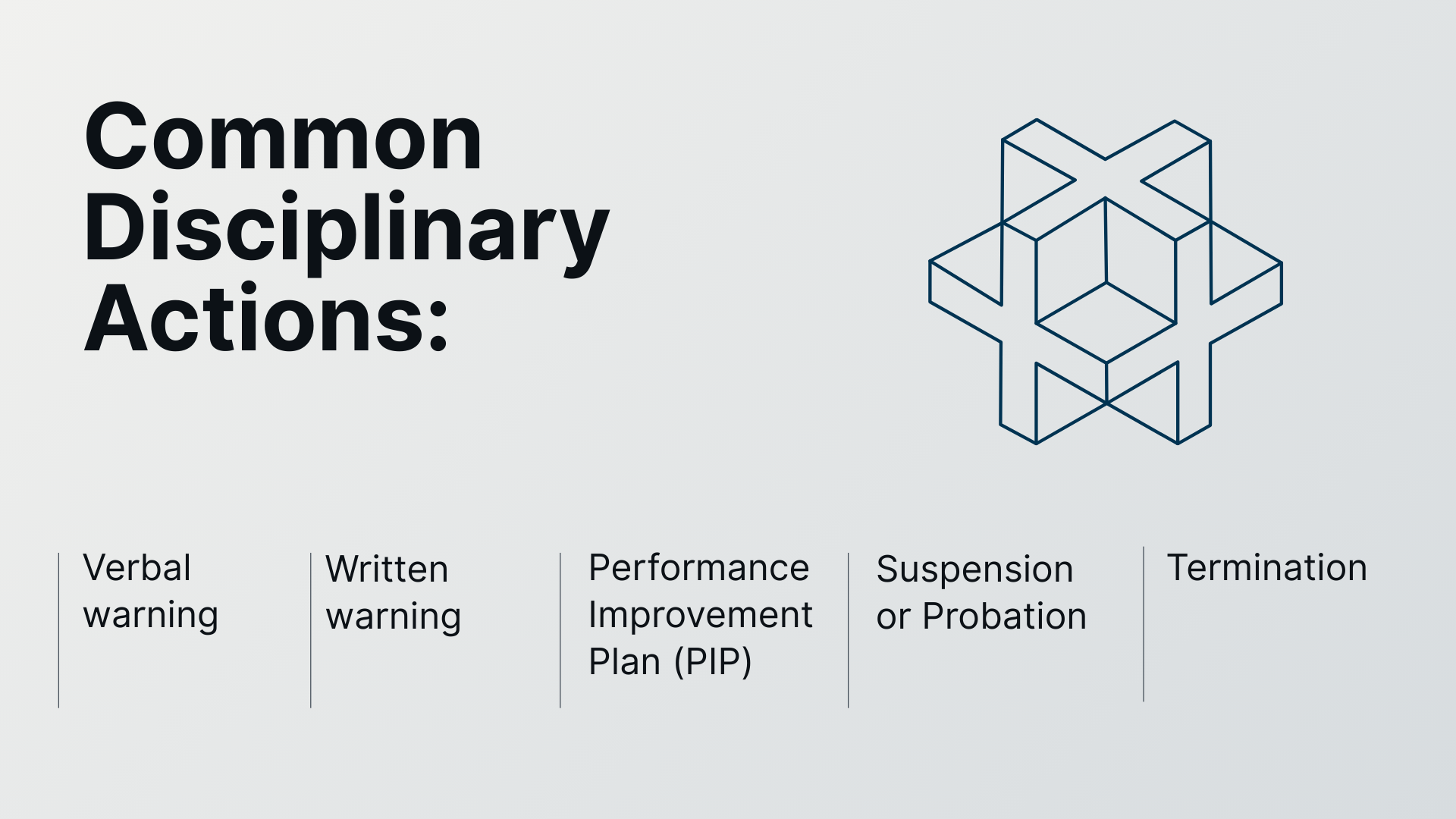 Typical actions include verbal warnings, written warnings, performance improvement plans, suspension or probation, and termination. Many employers use progressive discipline to escalate consequences.