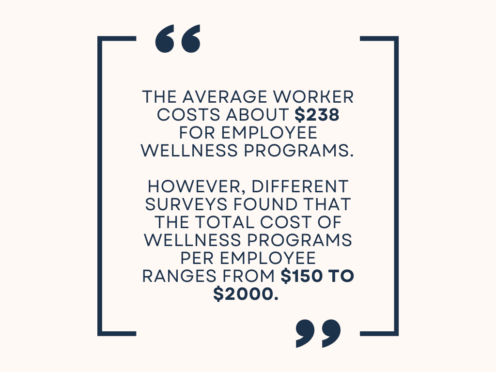 The average worker costs about $238 for employee wellness programs. However, different surveys found that the total cost of wellness programs per employee ranges from $150 to $2000.
