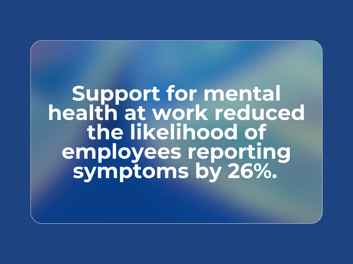 Research shows that support for mental health reduced the likelihood of workers reporting symptoms by 26%. Additionally, it correlated with fewer performance issues, greater comfort discussing mental health, higher job satisfaction and retention, and a more positive perception of the company and its leadership.