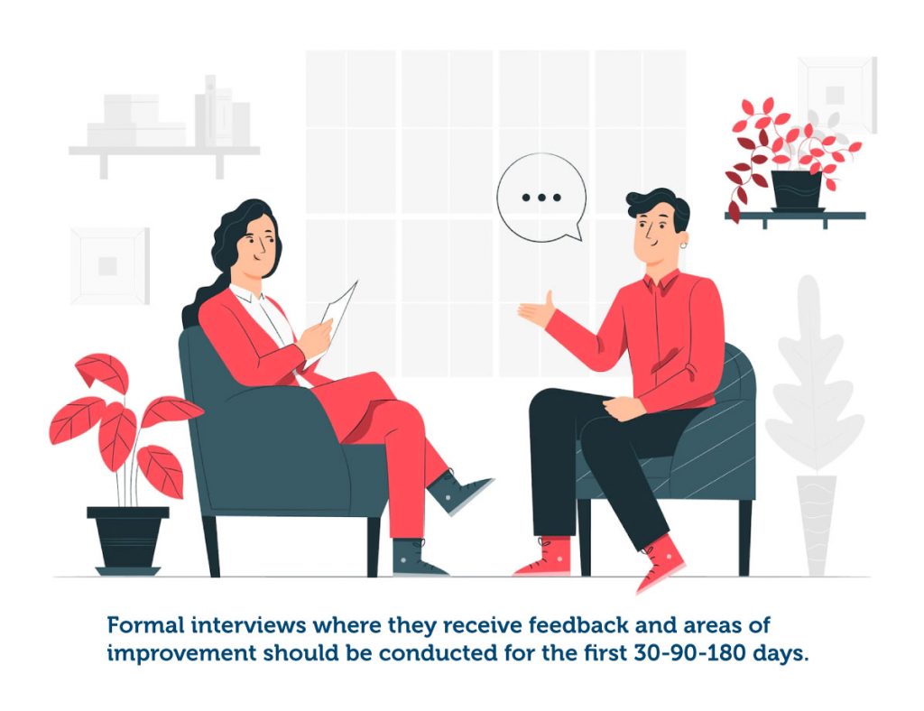 The performance management process is vital in establishing good communication with a new hire. Formal interviews where they receive feedback and areas of improvement should be conducted for the first 30-90-180 days.