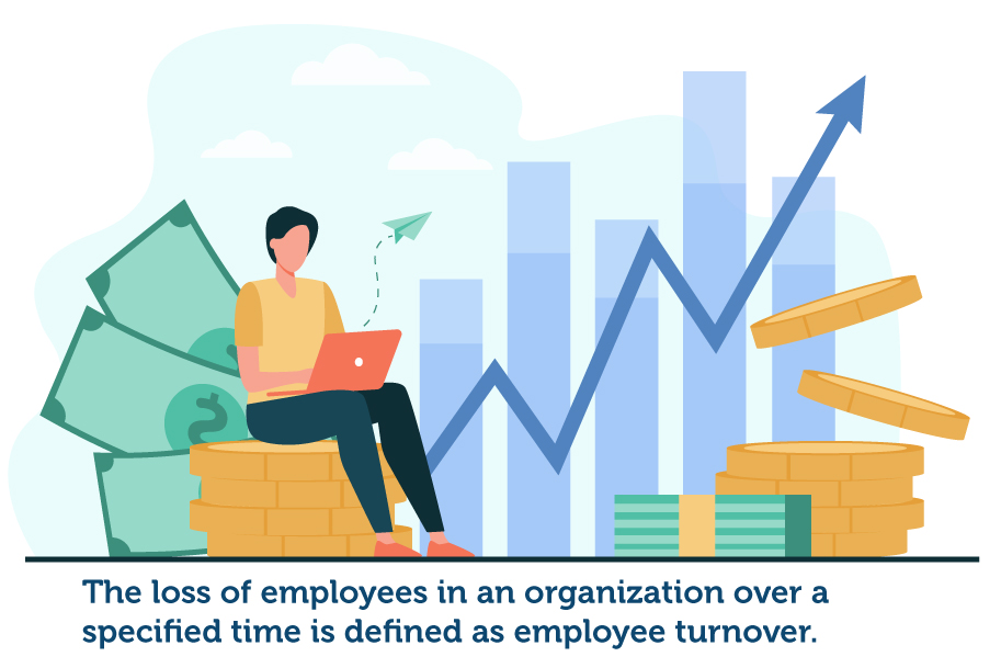 A simple definition of employee turnover would be the loss of employees in an organization over a specified time, usually one year.
