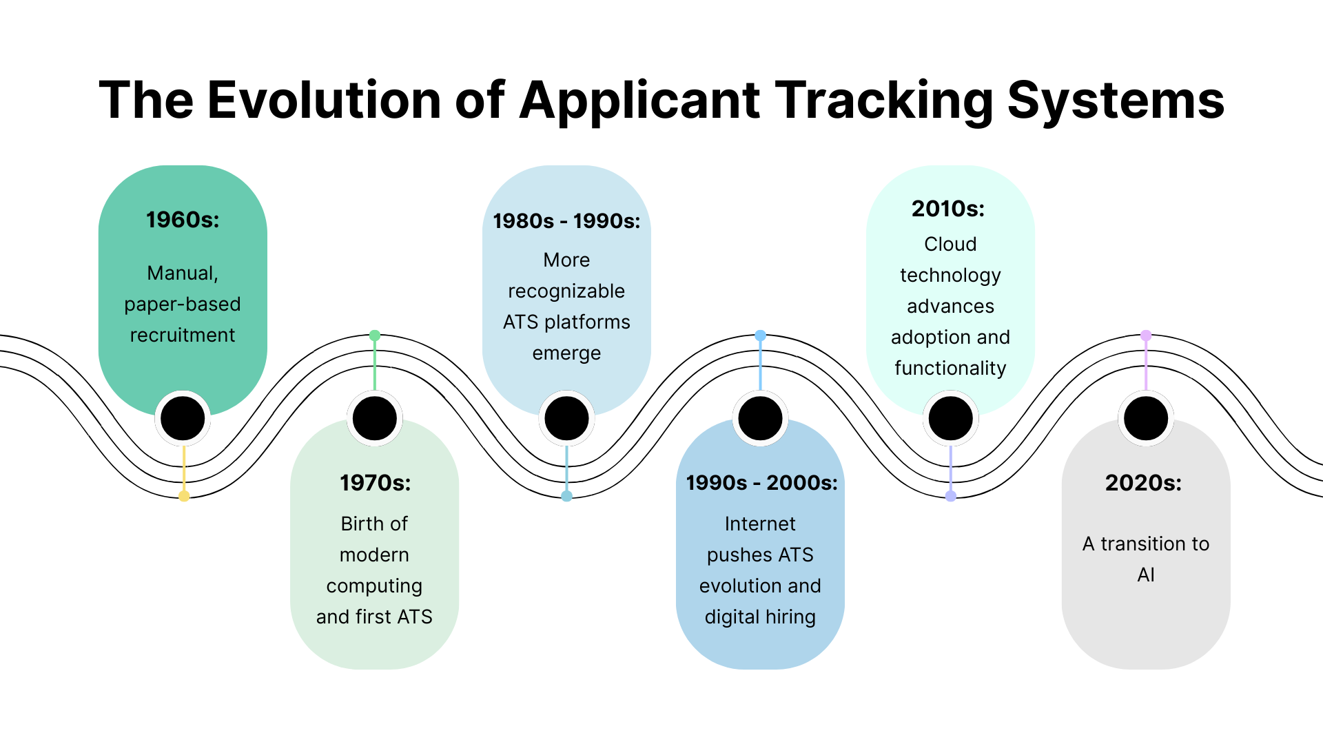 This timeline traces the evolution of applicant tracking systems, from paper resumes to AI-driven recruitment: