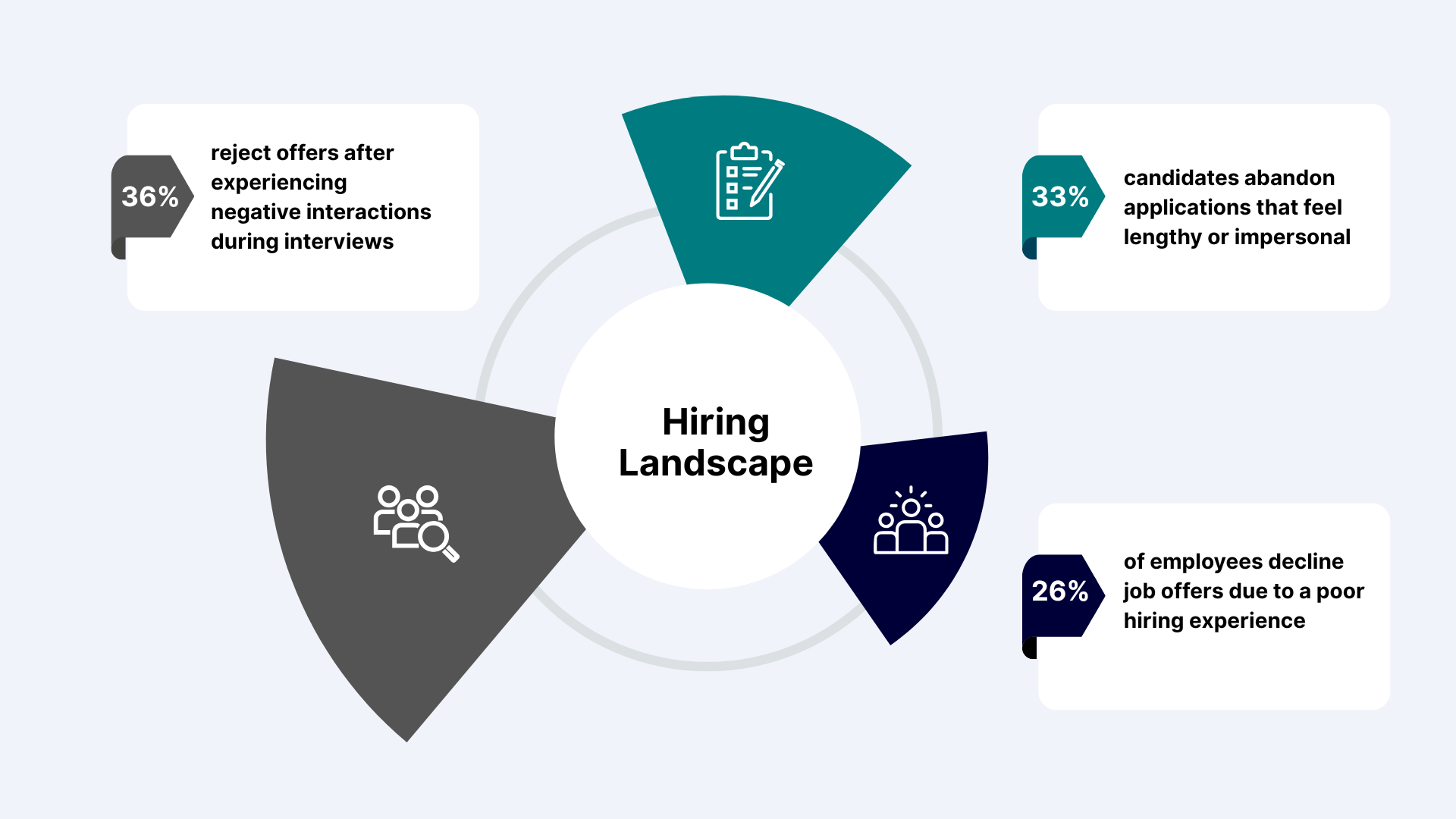 Findings from the report also show that candidates respond sharply to the design of the process. In fact, 33% abandon applications that feel lengthy or impersonal, and 36% reject offers after experiencing negative interactions during interviews.