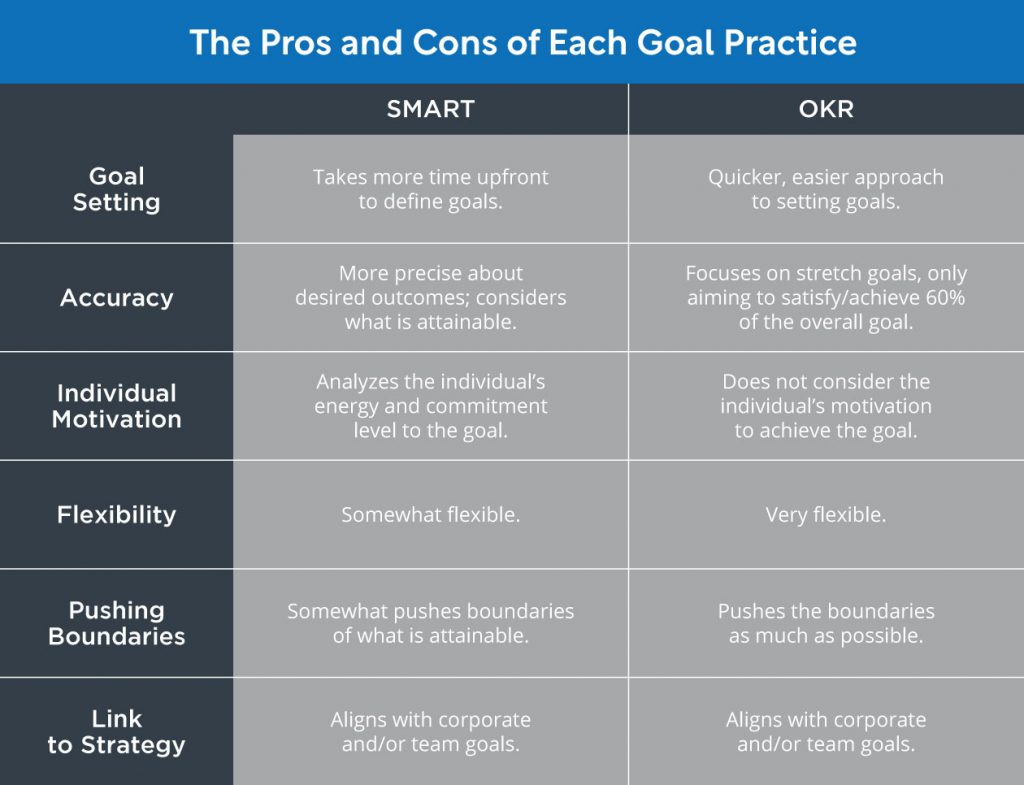 While most companies are already aware that these goals need to be SMART (specific, measurable, achievable, realistic, and trackable), companies like Google and Intel often use “Objectives and Key Results” (OKRs). A critical difference between OKRs and SMART objectives is in the level of ambition.