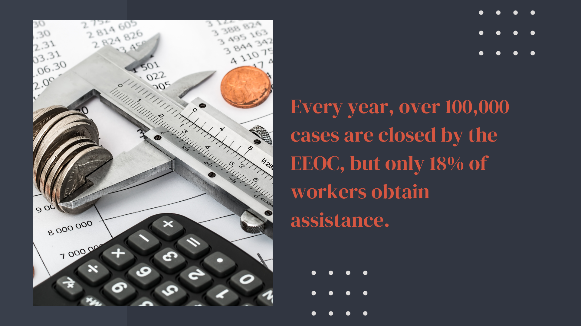 Every year, over 100,000 cases are closed by the EEOC, but only 18% of workers obtain assistance, such as financial or workplace adjustments. In fact, the percentage of cases resulting in worker assistance has decreased over the past decade, from 19% in 2007 to 13% a decade later.