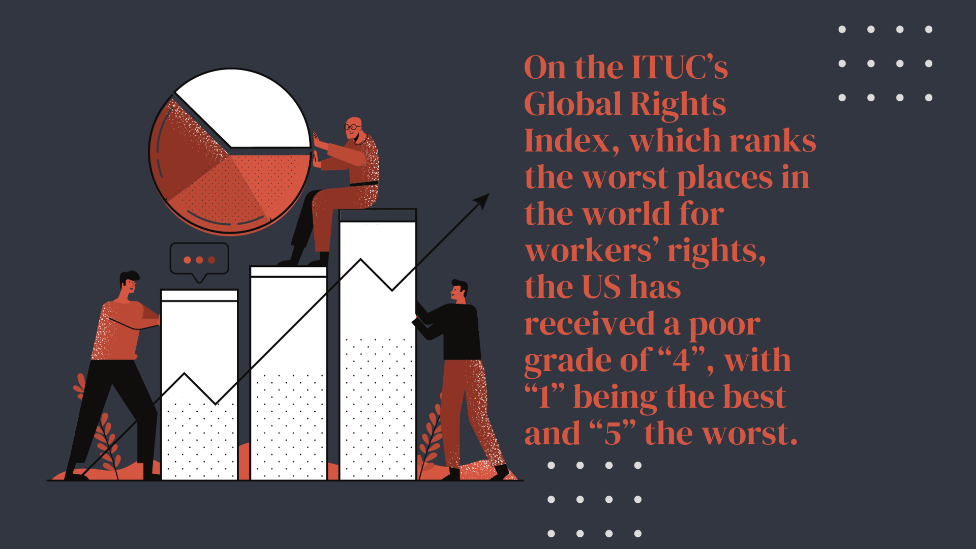 For example, on the ITUC’s Global Rights Index, which ranks the worst places in the world for workers’ rights, the US has received a poor grade of “4”, with “1” being the best and “5” the worst.