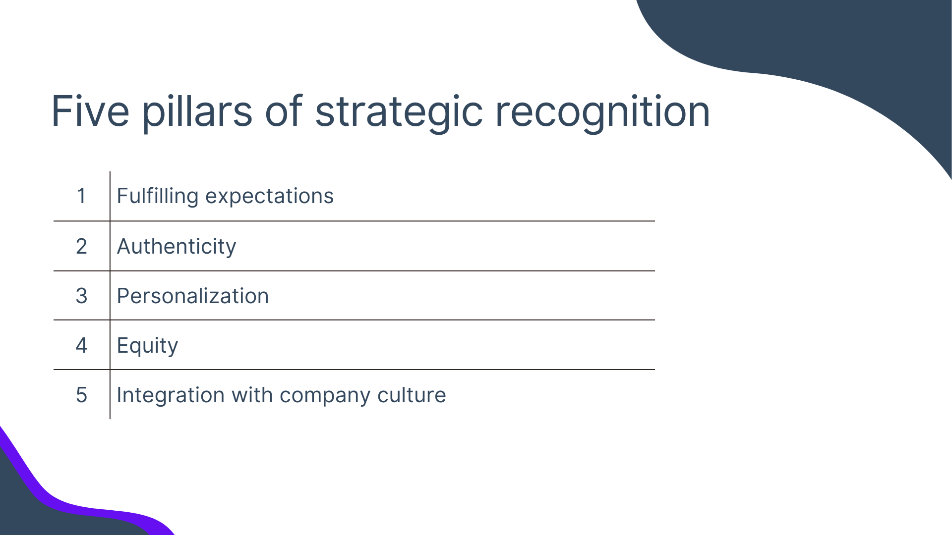 The same research also identifies five pillars of strategic recognition: fulfilling expectations, authenticity, personalization, equity, and integration with company culture.