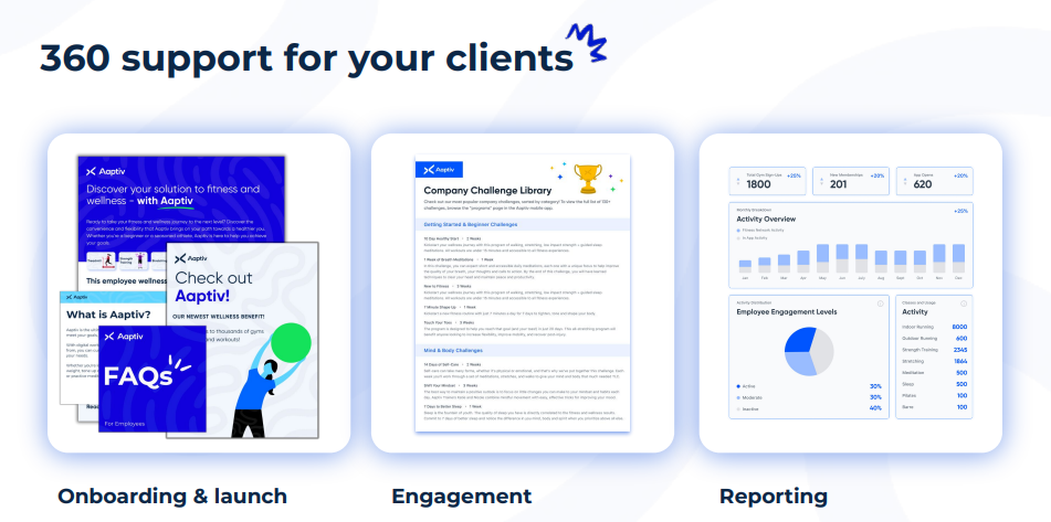 With personalized fitness plans, on-demand workouts, company-wide challenges, and access to an extensive gym network, Aaptiv provides your client’s employees with the tools they need to make fitness an enduring habit. Reach out to Aaptiv dedicated team today to offer your employees access to these invaluable resources and more!