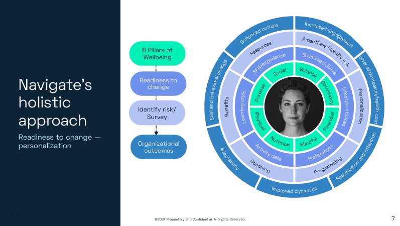 Navigate’s model revolves around their 8 Pillars of Wellbeing: Balance, Community, Financial, Mindful Nutrition, Physical, Purpose, and Social.. This framework ensures a comprehensive approach to employee health, addressing everything from mental and financial health to social connections and career growth.