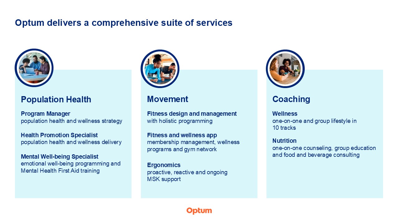 What differentiates Optum’s strategy is its seamless integration of physical, mental and emotional health into one cohesive experience. Instead of isolated programs, Optum provides a comprehensive range of services—including population health coaching, ergonomics, mental well-being support and nutrition counseling.
