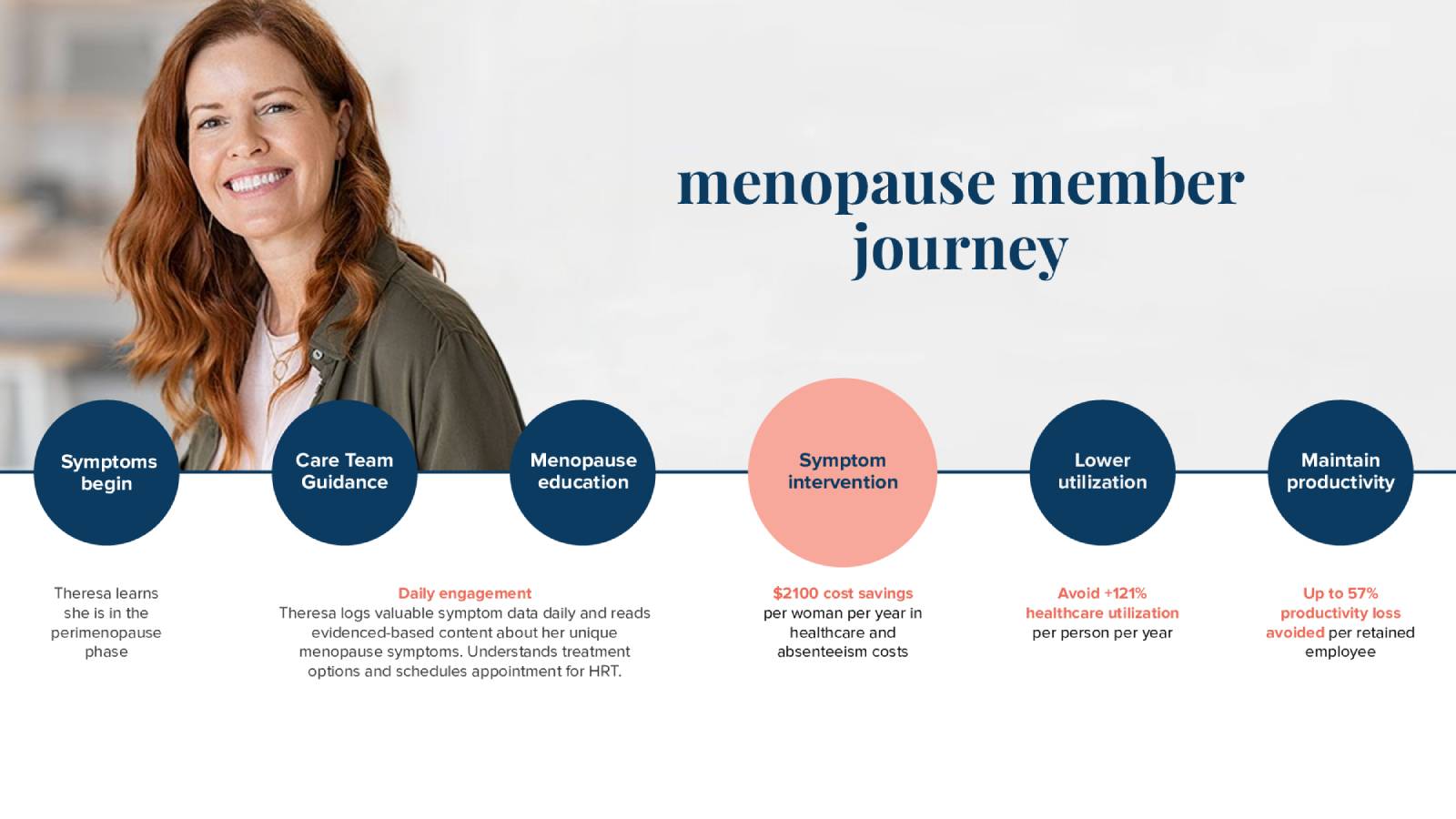 Up to 73% of women do not currently treat their menopause symptoms, yet 75% experience disruptive VMS, including night sweats and hot flashes. With Ovia’s menopause support, members like “Theresa” can recognize they are in perimenopause, log symptoms, explore treatment options, and maintain productivity. The result? An average cost savings of $2,100 per woman per year, and up to a 57% reduction in productivity loss.