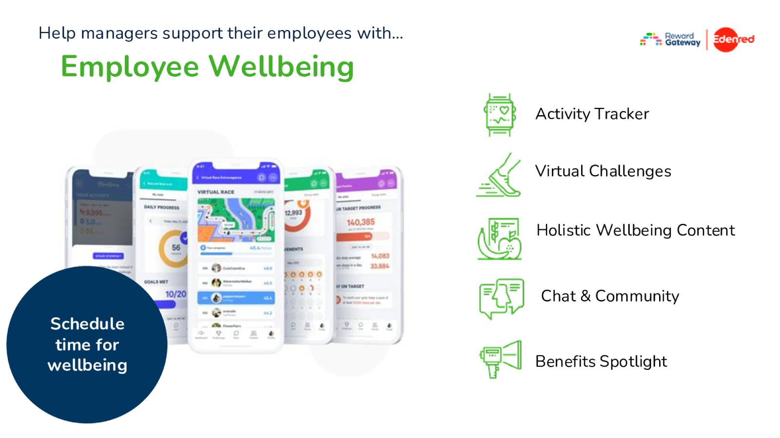 Reward Gateway | Edenred understands that wellbeing isn’t one-size-fits-all. That’s why their platform includes virtual fitness challenges, wellbeing content, and activity trackers to encourage healthy habits. Managers are also empowered to schedule wellbeing check-ins and spotlight benefits their teams might not even realize are available.