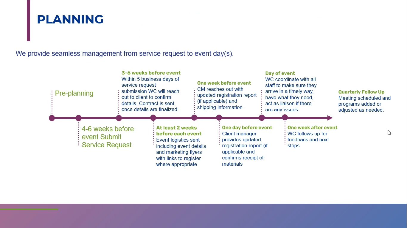 • Day of event: Staff are coordinated to arrive on time and act as onsite support