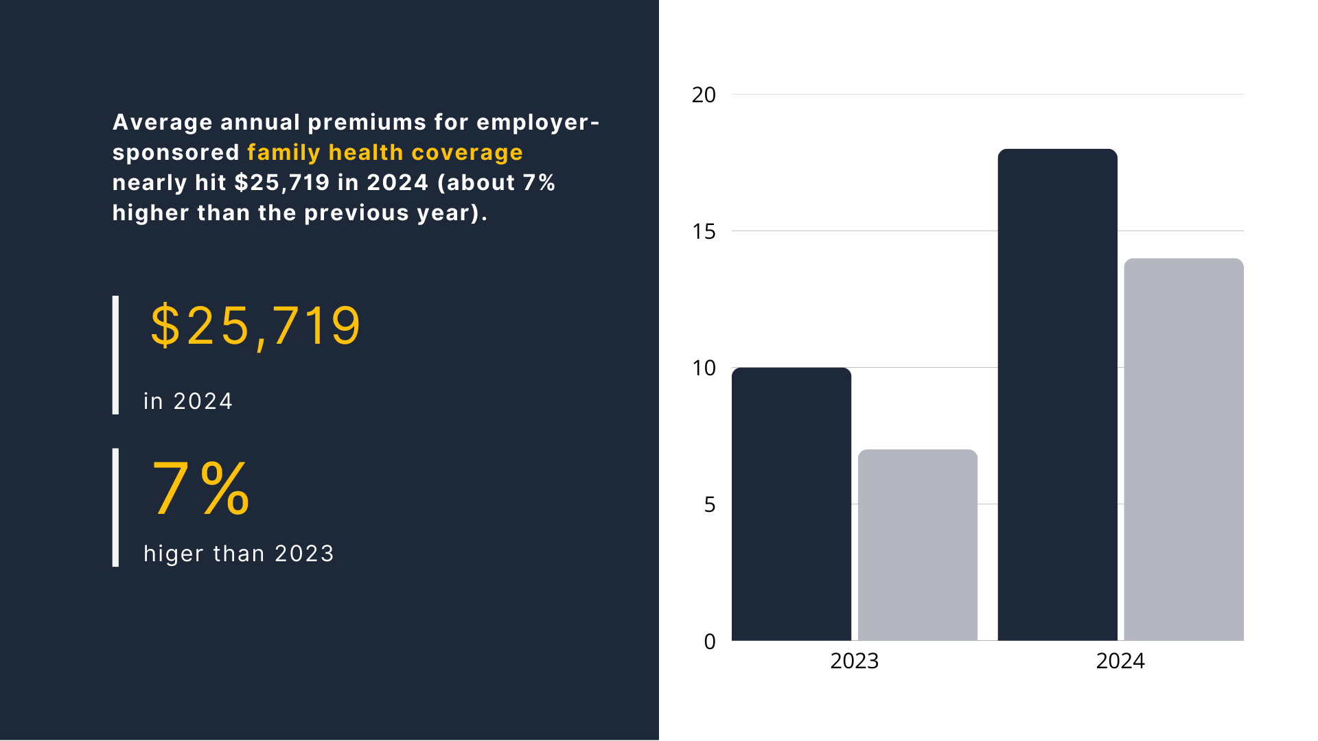 Average annual premiums for employer-sponsored family health coverage nearly hit $25,719 in 2024 (about 7% higher than the previous year).