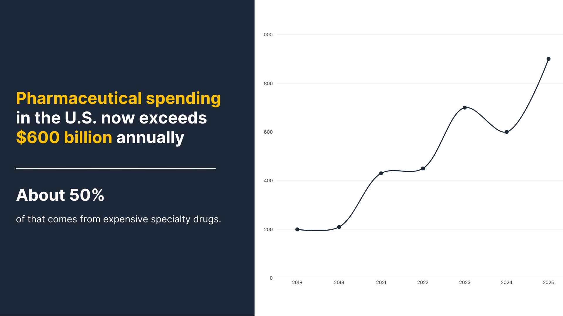 In fact, pharmaceutical spending in the U.S. now exceeds $600 billion annually, and about 50% of that comes from expensive specialty drugs.