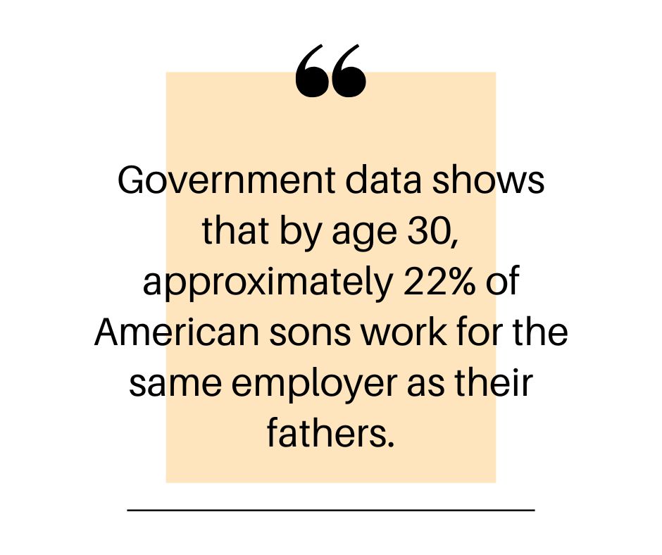 Government data also shows that by age 30, approximately 22% of American sons work for the same employer as their fathers, a statistic that exceeds the probability of mere chance.