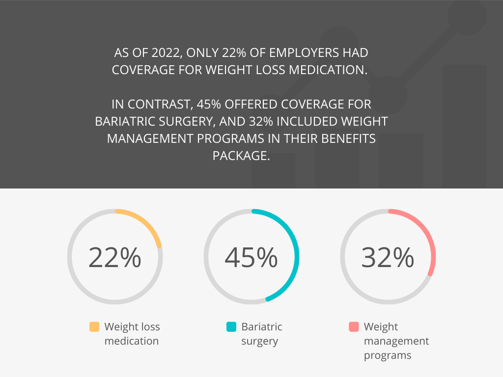 While the majority of employers provide various wellness programs, along with diabetes programs, as of 2022, only 22% of employers had coverage for weight loss medication. In contrast, 45% offered coverage for bariatric surgery, and 32% included weight management programs in their benefits package.