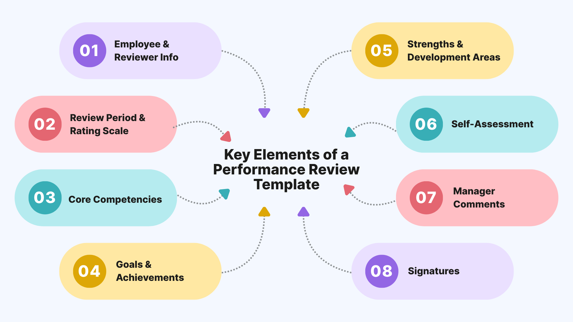 A well-designed employee performance review template includes several elements, each serving a specific purpose in creating comprehensive, actionable feedback. Although not every section applies equally to all review types, understanding them helps ensure a complete and flexible framework.