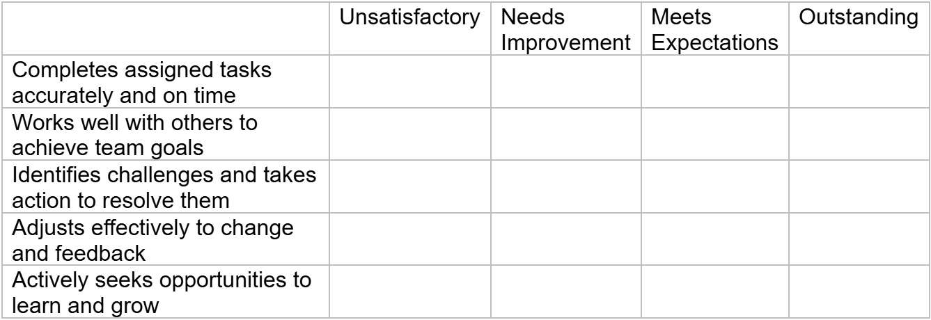 For example, a five-point scale ranging from “does not meet expectations” to “exceeds expectations” gives an evaluation structure and helps differentiate between satisfactory and exceptional performance.