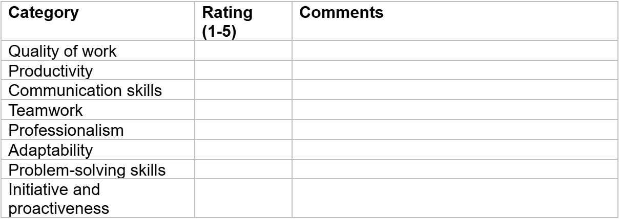Depending on the role, main competencies might include technical skills, communication, collaboration, problem-solving, and leadership. Each should be considered separately, with space for rating and supporting comments.