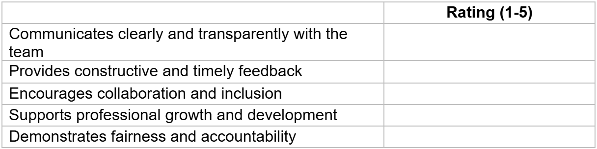 Use a simple numerical scale for employees to assess key areas of team performance, such as collaboration, accountability, and problem-solving.