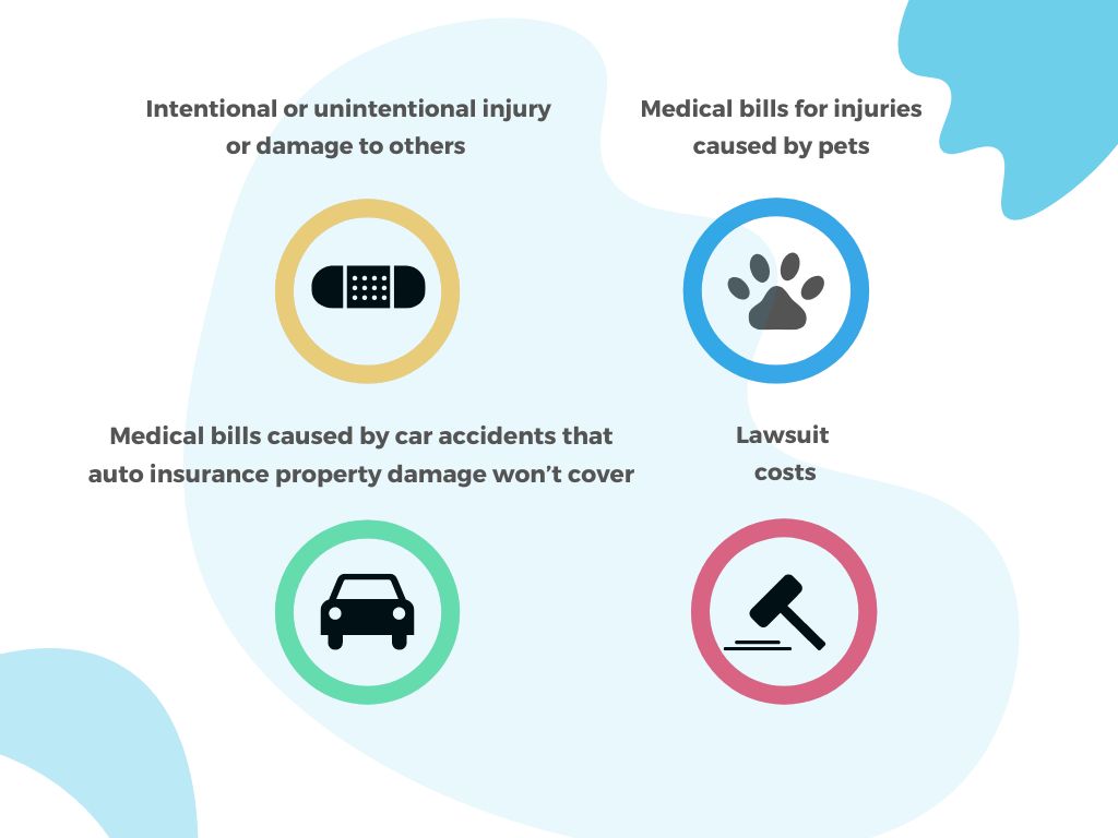 Although it doesn’t necessarily fall under the same category as the others, personal umbrella insurance is what covers liabilities when regular auto insurance or homeowners, condo, and renters’ policies won’t.