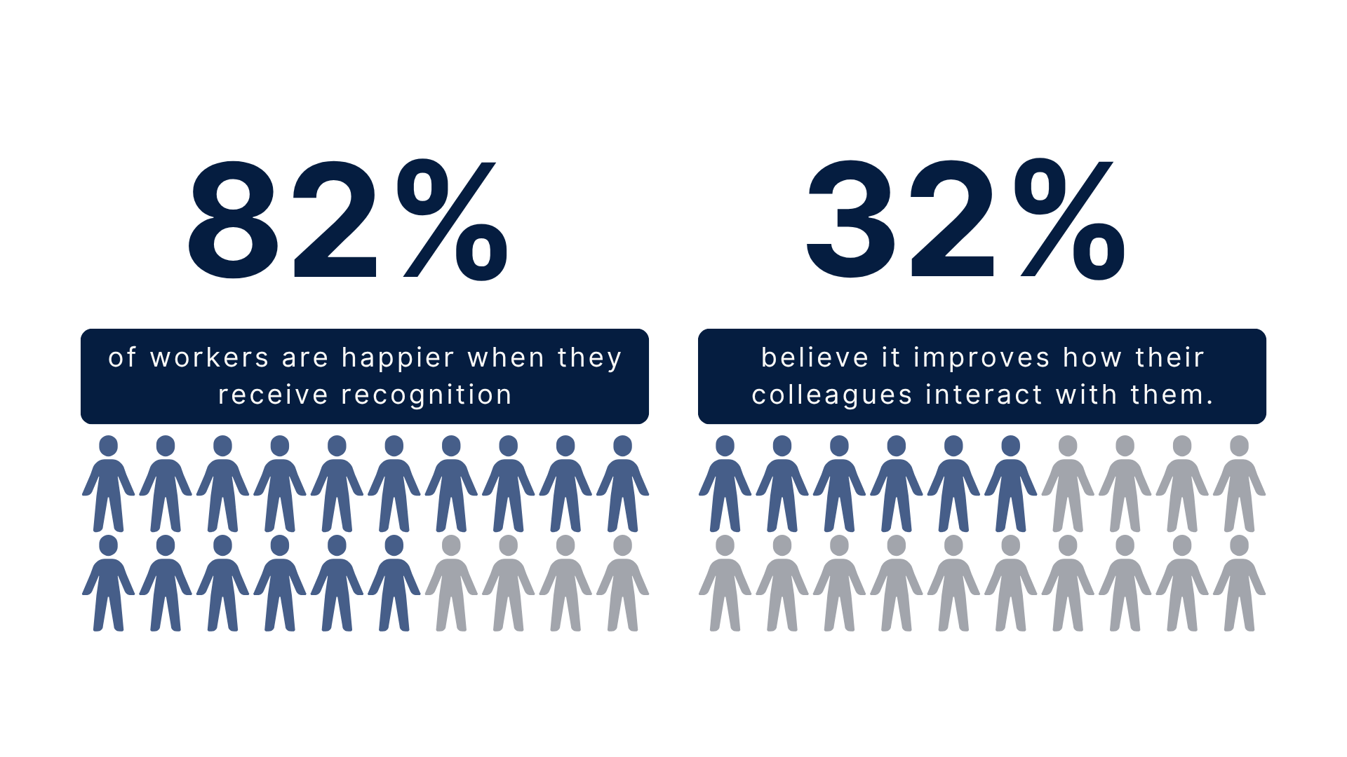 According to SurveyMonkey, 82% of workers are happier when they receive recognition, and 32% believe it improves how their colleagues interact with them.