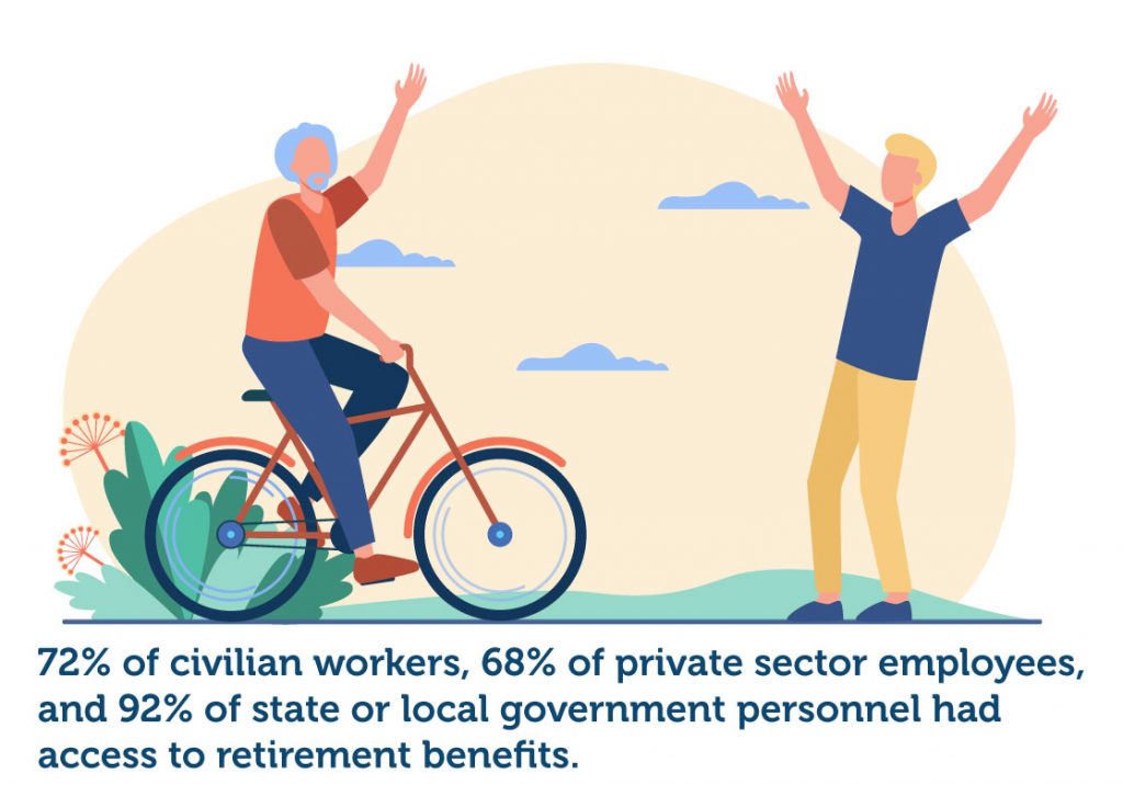 A CRS report shows that in March 2021, 72% of civilian workers, 68% of private sector employees, and 92% of state or local government personnel had access to retirement benefits.