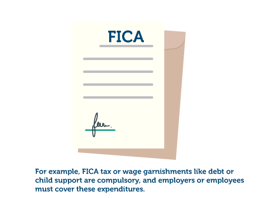 For example, FICA tax or wage garnishments like debt or child support are compulsory, and employers or employees must cover these expenditures.