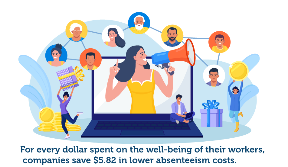 Wellness statistics reveal that 70% of employees enrolled in such programs have higher job satisfaction. The numbers also show that for every dollar they spend on the well-being of their workers, companies save $5.82 in lower employee absenteeism costs.