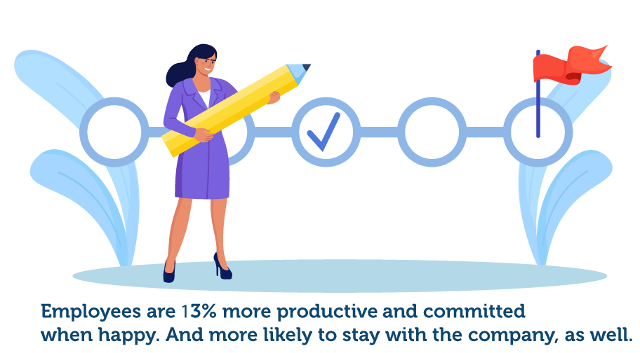 A happy employee is 13% more productive, commits twice as much to a task, and is likelier to stay with the company.