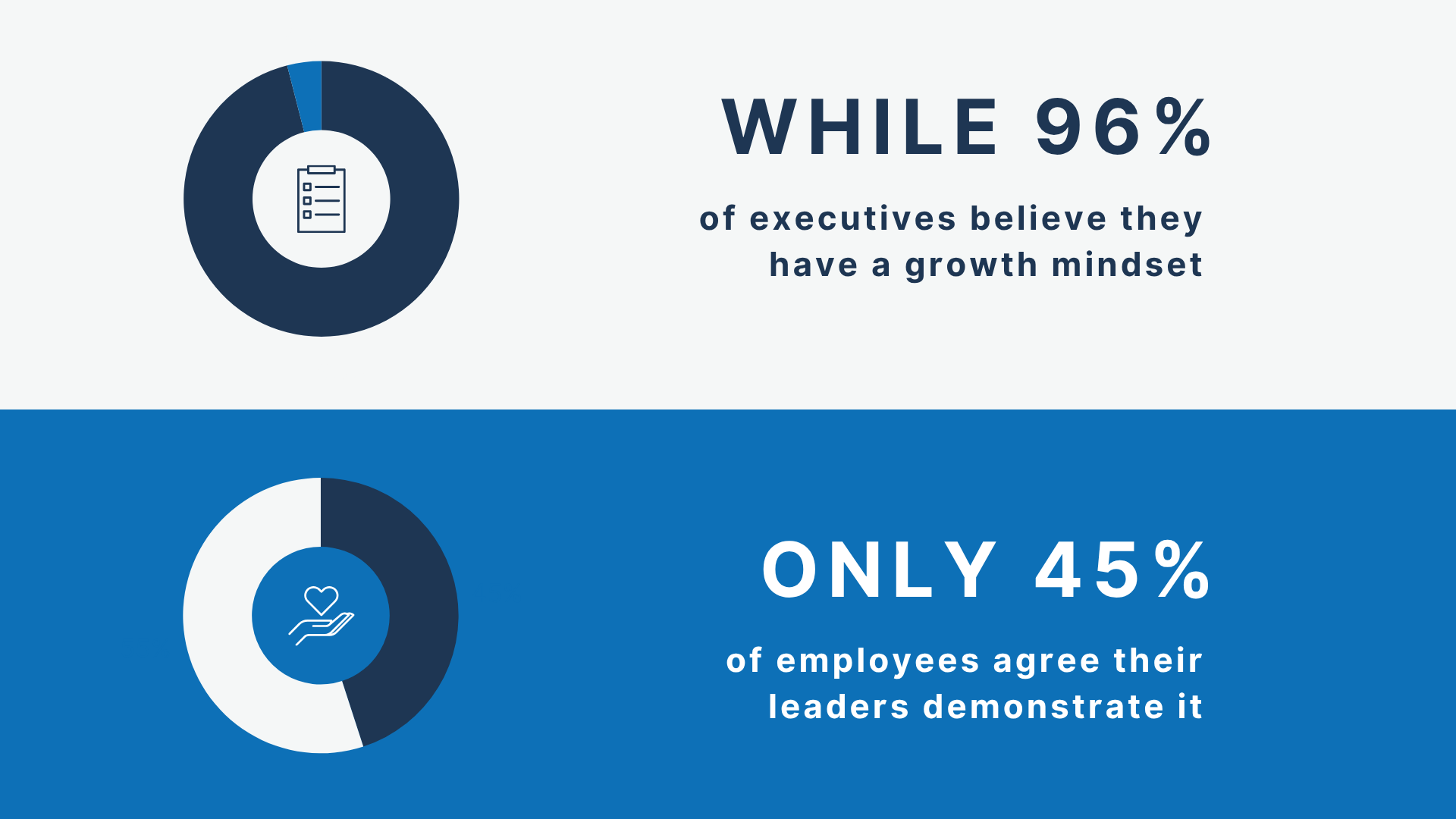 Perhaps the most significant barrier is when leaders aren’t truly aligned with growth mindset principles. While 96% of executives believe they have a growth mindset, only 45% of employees agree their leaders demonstrate it.