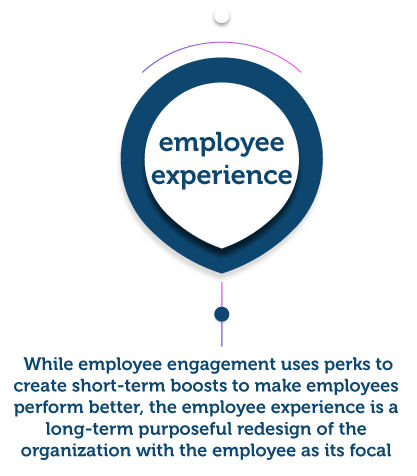 Contrary to what many assume, employee experience is not the same as employee engagement. While employee engagement uses perks to create short-term boosts to make employees perform better, the employee experience is a long-term purposeful redesign of the organization with the employee as its focal point.