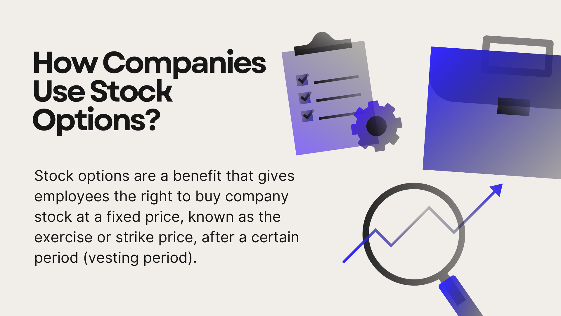 Stock options are a benefit that gives employees the right to buy company stock at a fixed price, known as the exercise or strike price, after a certain period (vesting period).