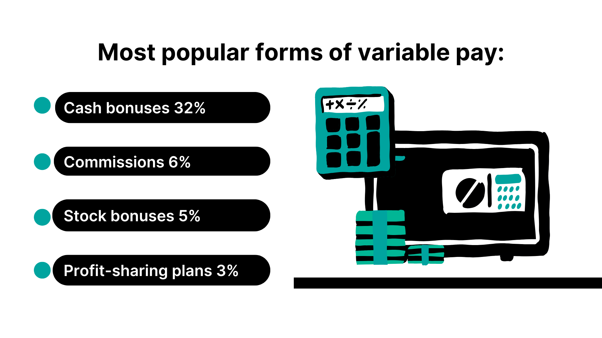 The research on variable compensation we referenced earlier shows that cash bonuses are the most common, received by nearly one-third of employees (32%), followed by commissions (6%), stock bonuses (5%), and profit-sharing plans (3%).