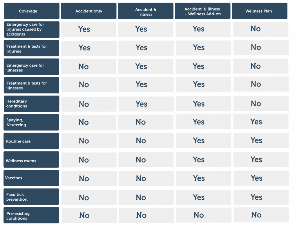 Accident and illness is a more comprehensive insurance plan with accident benefits plus coverage for procedures such as x-rays, surgery, and hospitalization for more serious illnesses like cancer, infections, and digestive problems. It does not include routine vet visits, flea and heartworm prevention, or vaccinations.