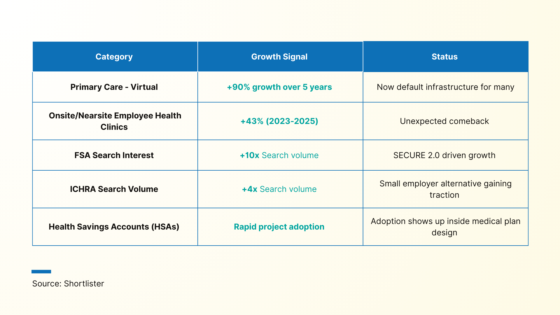 Primary data includes five years of employer activity on the Shortlister platform (2020–2025), representing millions of employee lives annually. We analyzed actual buying patterns, including searches, RFPs, and vendor selections.
