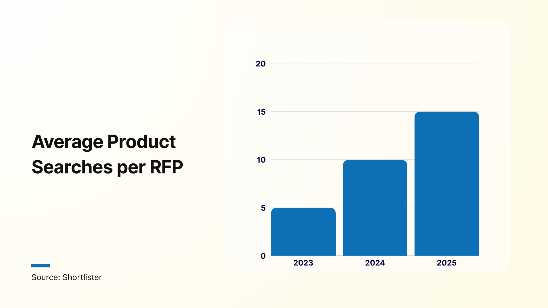 The data reveals a 74% increase in research intensity over just two years, with brokers now conducting an average of 14.3 vendor searches per RFP compared to 8.2 in 2023.